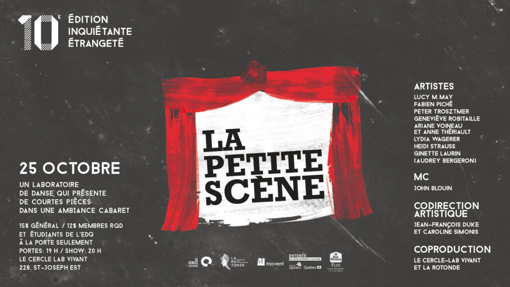 La petite scène, une plateforme de diffusion alternative, permet au public d’affiner son regard sur le mouvement en disposant d’un accès privilégié à la riche diversité de l’art chorégraphique. C’est donc à une soirée stimulante et riche en surprises que vous êtes conviés le 25 octobre prochain au Cercle-Lab vivant!