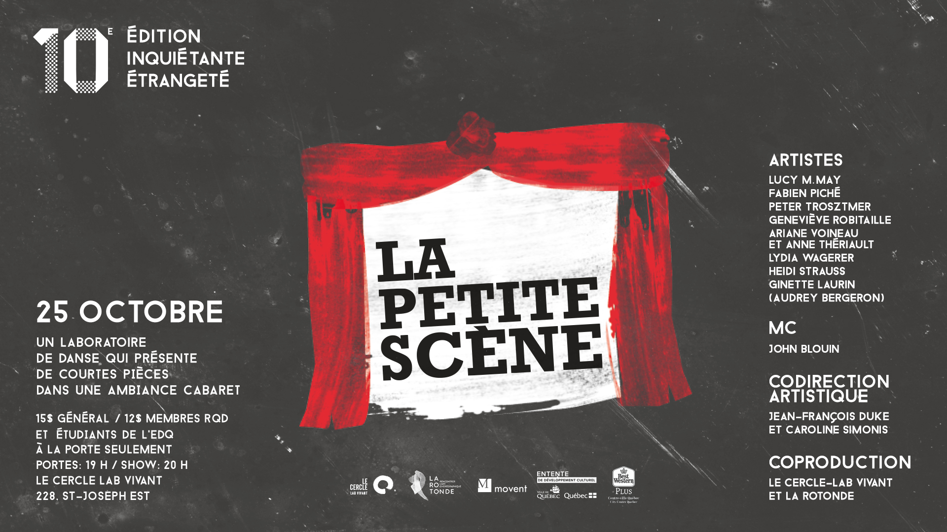 Le Cercle – Lab vivant et La Rotonde présentent déjà la dixième édition de de La petite scène, cet événement devenu un incontournable pour voir de la danse autrement à Québec! Le mercredi 25 octobre à 20 h, c’est à un véritable laboratoire de création dansée que vous assisterez alors que huit danseurs venus de Québec, Montréal et Toronto présenteront une courte chorégraphie inspirée du thème « inquiétante étrangeté ».
