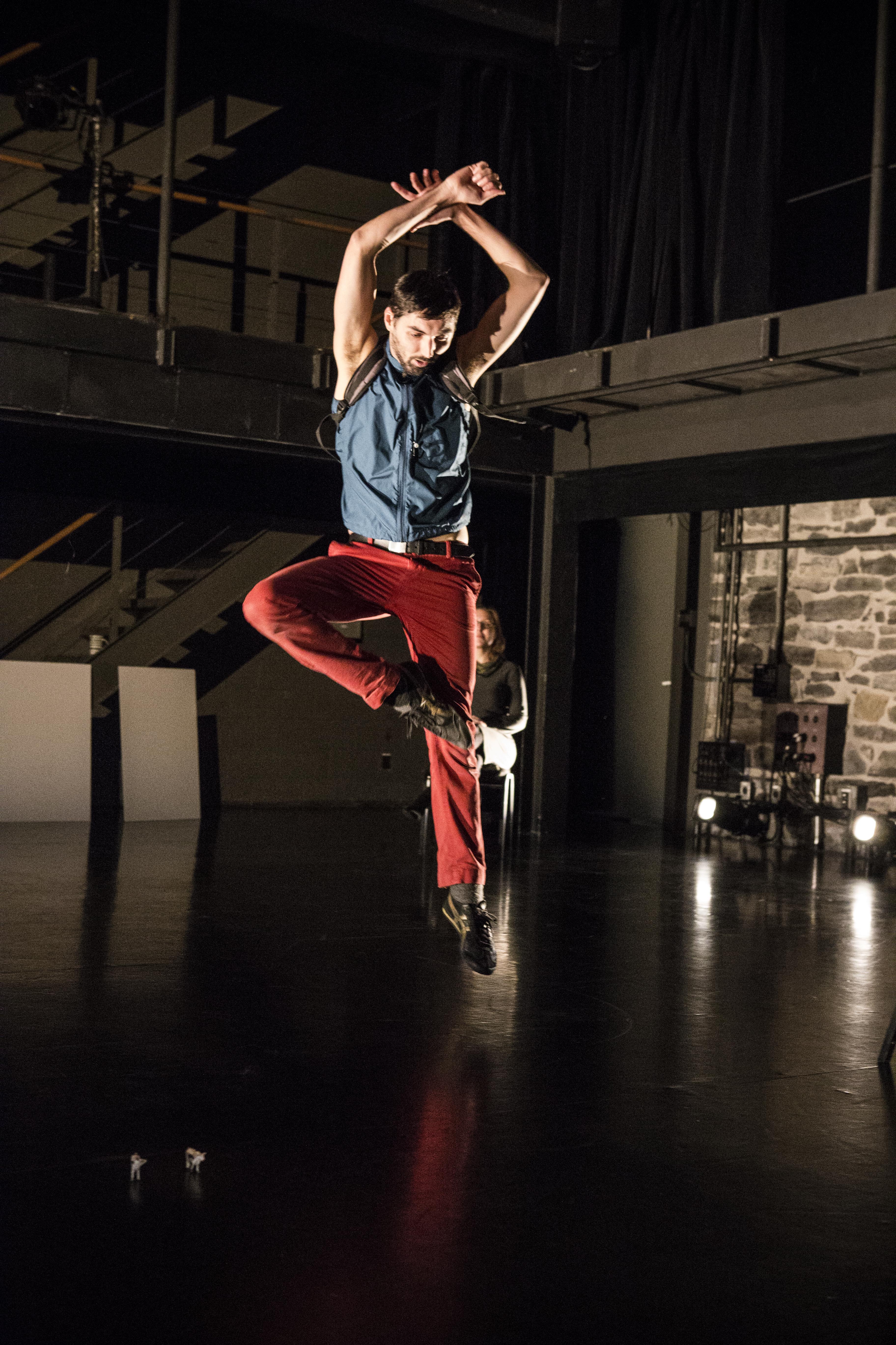 Brice Noeser : La danse est parfois en format miniature, parfois imaginée, parfois décrite et quelques fois incarnée en plus grand. Je me suis questionné sur ce qu’on définissait comme étant de la danse, à partir de quel moment le mouvement devient une danse. Pour ma part, j’aime la possibilité que la danse ne soit pas juste une forme poétique, sacrée ou athlétique mais qu’elle puisse aussi parler, chanter, faire rire et s’articuler autrement que par une « suite rythmée et harmonieuse de gestes et de pas » (extrait du Larousse). Une autre définition du Larousse parle d’une « exécution codifiée d’actes moteurs jouant un rôle dans la transmission d’informations permettant le déroulement d’une activité particulière. » Si on jouait au jeu de dire une définition pour deviner un mot, je crois que beaucoup de gens resteraient perplexes. Mais cette définition est intéressante parce qu’elle donne une liberté dans la représentation du mot « danse ».