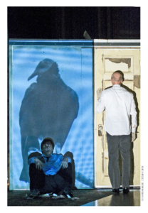 Il est là, sur le toit d’une cabane, sur le toit du monde, les pieds ballants. Drôle d’oiseau croassant, réveillant l’hôte de ce pauvre habitacle comme il y en a par milliers, aux quatre coins de la Terre. Des milliers de lieux de mémoire, des lieux investis d’existences passées qu’on laisse derrière soi, qu’on laisse aux vautours. CABANE, c’est l’éphémère d’une présence portant en elle l’éternité de chaque présence, un ici et maintenant contenant tout ce qu’il y a eu avant et ce qu’il y aura après… Mélanie Viau – Mai 2008 – Monthéâtre.qc.ca
