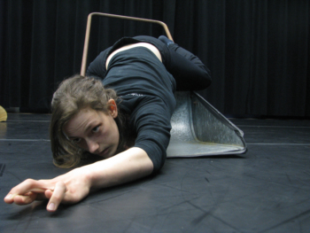 Le chariot de métal qui claque, la pelle à neige immense qui verse, les bûches transformées en plateforme lumineuse et des membranes qui s’étirent, autant de matières qui confinent et poussent le corps vers une gestuelle atypique et surprenante.