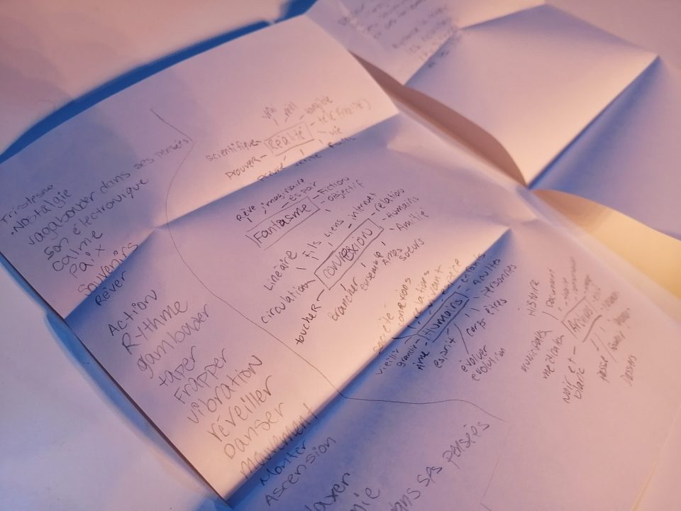 Animés par Valérie Forgues, les ateliers d’écriture s’articulent autour des thèmes explorés dans la représentation à laquelle les participant·es viennent d’assister. Dans un premier temps, une séance d’écriture automatique est proposée, comme un réchauffement, pour permettre aux participant·es de noter leurs impressions à chaud. Ensuite, un ou deux brefs exercices de création dirigés offrent l’occasion d’ouvrir le langage afin de garder une empreinte écrite de l’expérience vécue, un prolongement à la chorégraphie.