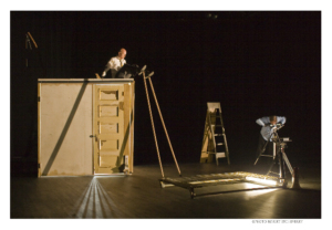 C’est en dansant le Solo 30×30 sur le toit de l’abri-vestiaire des chauffeurs de car à Nancy, en France, qu’est née l’idée d’un spectacle dans, autour et sur une cabane. Cette idée de spectacle s’est développée tout au long de l’itinérance du Solo 30×30. Tout à la fois danse, théâtre, musique et performance, Cabane se rapproche plus de l’installation in situ que du spectacle formel.