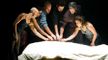 La chorégraphie de groupe a été créée en collaboration avec les huit interprètes. C’est un mode de création très courant en danse contemporaine, retrouvé dans S’envoler d’Estelle Clareton ainsi que dans la chorégraphie S de José Navas, tel qu’expliqué dans ma chronique Petit guide de lecture chorégraphique (décembre 2011). De plus, le questionnement à la base de la chorégraphie de Clareton (l’idée de migration et de mélanges culturels) a aussi porté Élodie Lombardo dans son processus créatif, elle qui a créé ce spectacle dans un mélange de langues et de cultures, autant au Mexique qu’au Québec, en compagnie d’interprètes de trois continents. Enfin, comme dans S’envoler, nous retrouvons aussi dans cette une danse un groupe en train de se créer des rituels.