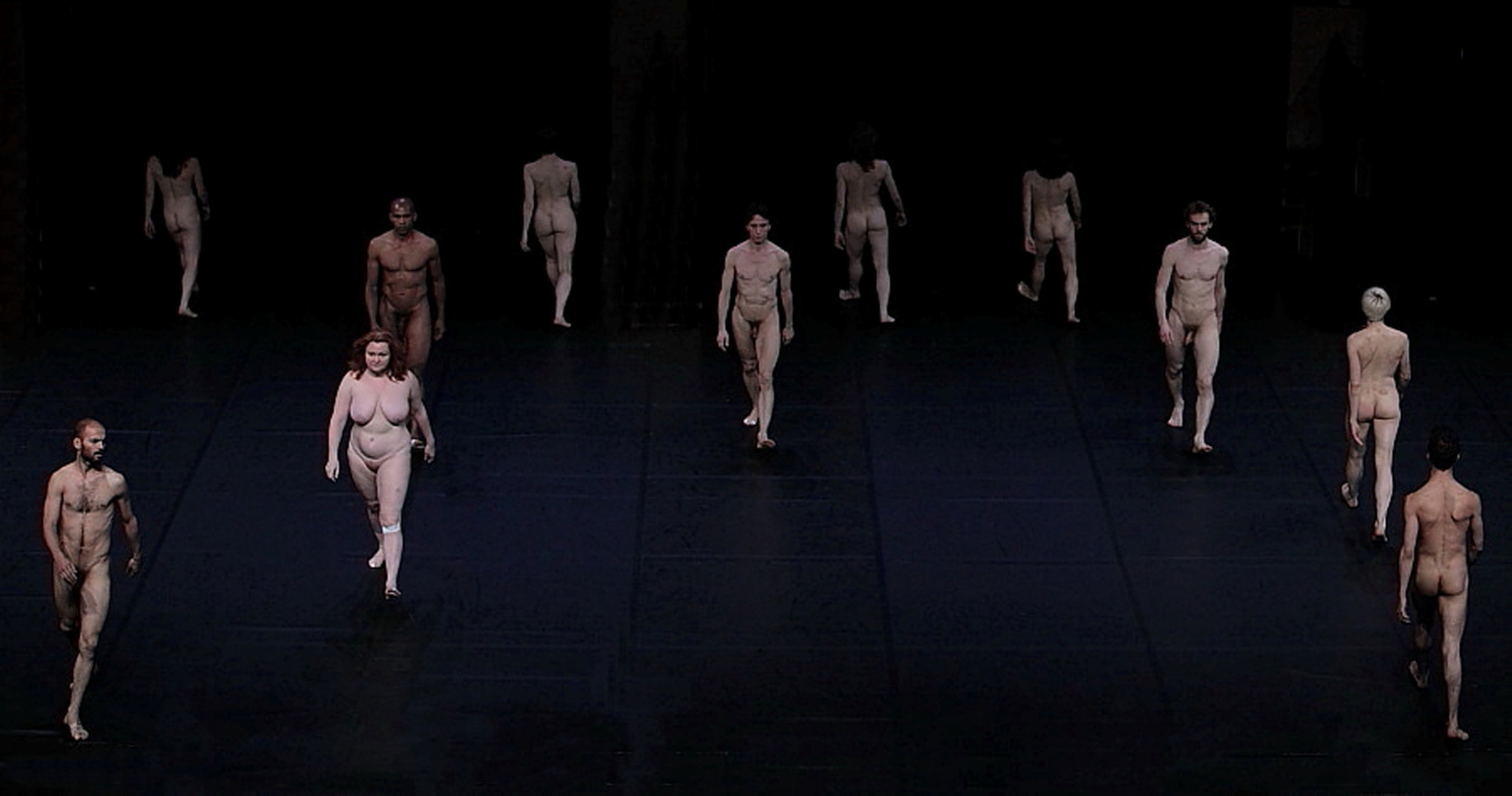 Sur une scène vide, neuf femmes et neuf hommes se présentent dans une nudité totale qui les débarrasse de toutes connotations historiques, sociologiques ou psychologiques. Dans une série d’allers et de retours incessants, qui commencent de manière militaire et dont les mouvements semblent sans intentions, ils arrivent à construire, avec des gestes très codifiés, une chorégraphie « manifeste, obsessionnelle, voire hypnotique où, dans un mouvement de sac et de ressac, ces femmes et ces hommes se fondent et disparaissent; le frottement de leurs engagements crée le fracas. »[v]