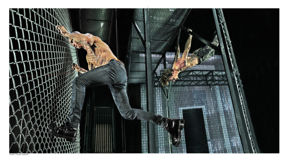 L’actualisation de l’œuvre a bien sûr été menée dans la cage originelle, qui continue d’être le troisième partenaire de la chorégraphie. Cette structure métallique faite de barrières, de couchettes et de passages au-dessus de la scène est beaucoup plus qu’un décor. Les danseurs s’y suspendent autant qu’ils s’y confrontent. Ils la brassent et la font résonner pour évacuer drames et frustrations. Exploités au maximum de leurs potentiels et selon les sections chorégraphiques, les différents éléments évolutifs de la cage servent d’appuis ou de frontières (entre les deux interprètes, leurs cellules et leur cour intérieure, tout comme entre eux et nous: le public).
