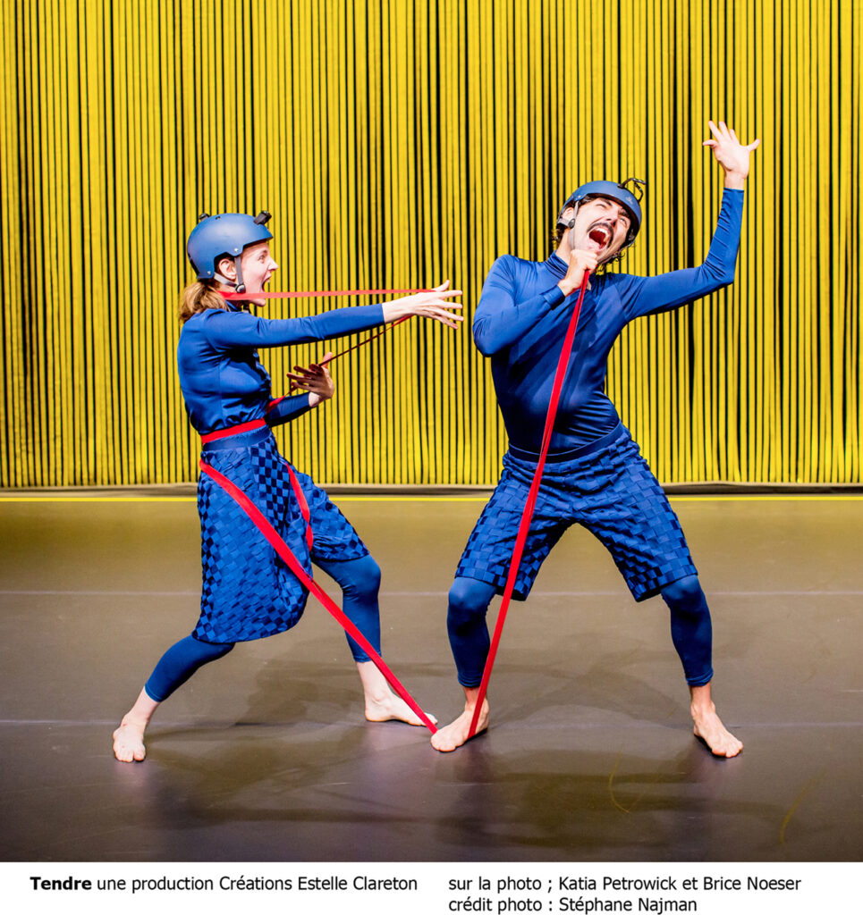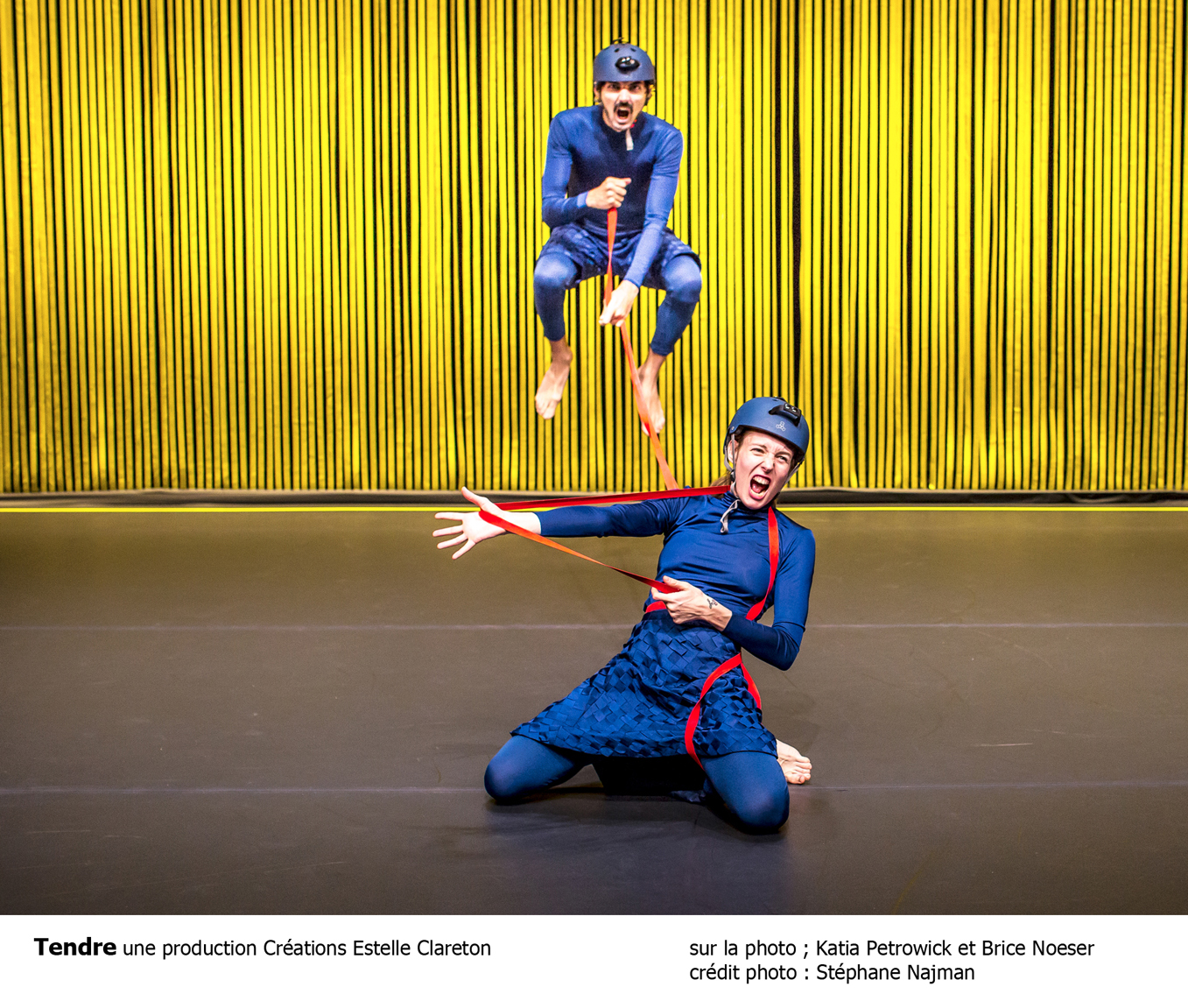 Créé en 2015 et présentement en tournée québécoise pour la saison 2017-2018, le spectacle Tendre d’Estelle Clareton est présenté au Théâtre jeunesse Les Gros becs en matinées scolaires et en spectacle familial. Deux personnages sur scène sont liés par un long élastique qui les amènera à conjuguer leurs efforts pour s’acclimater l’un l’autre à travers un jeu comique très vivant utilisant danse et jeu clownesque. Le titre « Tendre » fait référence à la tendresse enfantine ainsi qu’à la tension de l’élastique, symbole des relations enfantines à créer et maintenir avec la fratrie, les amis et l’environnement social.
