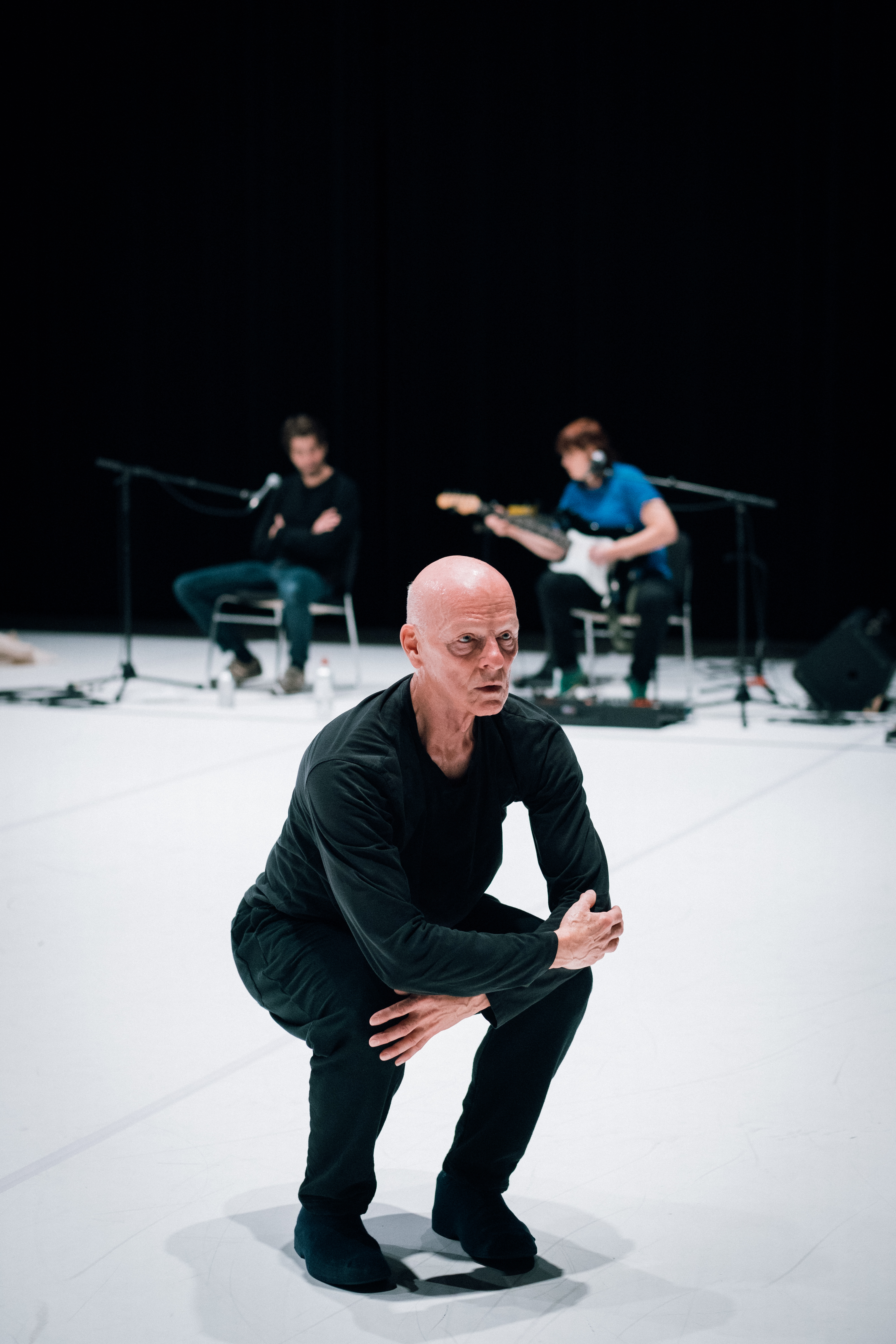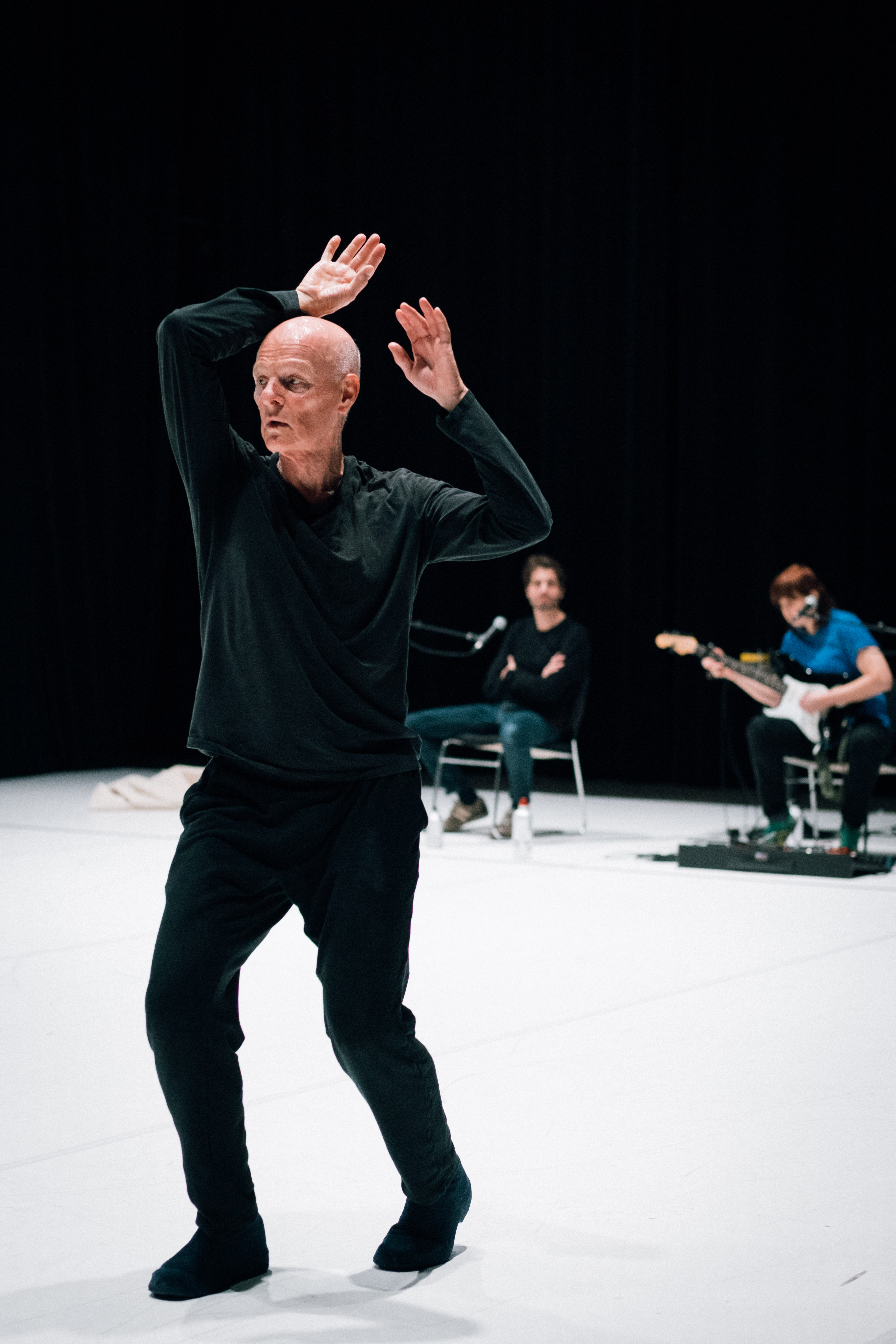 Dans Solo 70, Paul-André Fortier est accompagné de deux comparses qui vont influencer le courant des choses. Dès l’entrée du public, on les voit sur scène et ces deux personnes s’avéreront être un comédien et une musicienne. Assis, immobiles et tranquilles pendant le premier quart du spectacle, ils prendront ensuite une large place dans la trajectoire du danseur.