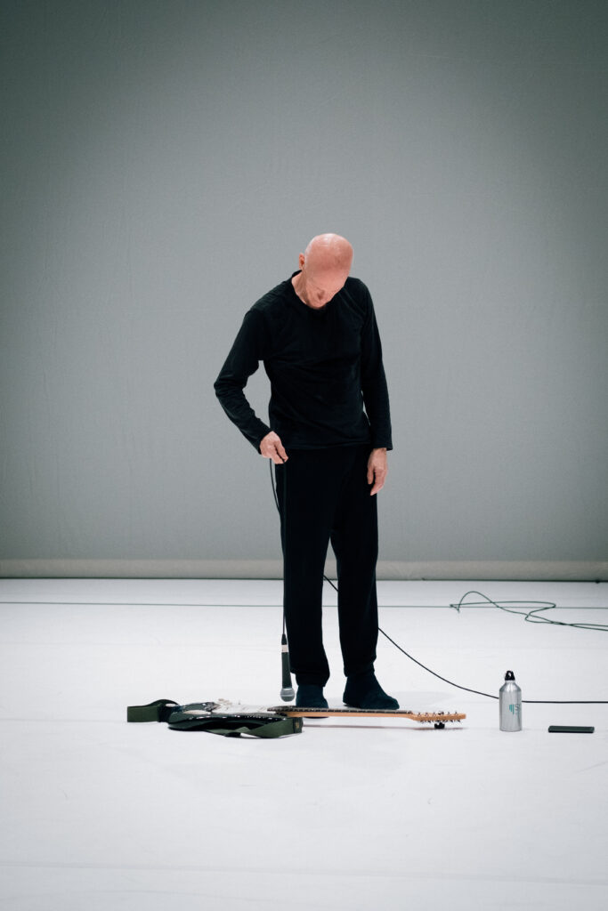 Coulisses ouvertes, un grand espace blanc est fortement éclairé. Le sol y est dessiné de fines lignes délimitant une aire de jeu carrée. Cet espace accueille les déambulations d’un personnage qui marche. Il marche en silence. Il marche à travers l’espace scénique, toujours devant, tête baissée. Souvent, ses pas sont glissants.