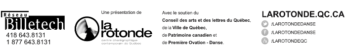 CanDanse: échanges en création / CanDance Creative Exchange est une coprésentation du réseau CanDanse, Live Art Dance Productions, La Rotonde et Tangente et bénéficie du soutien de la section de la danse du Conseil des arts du Canada et de Patrimoine canadien.