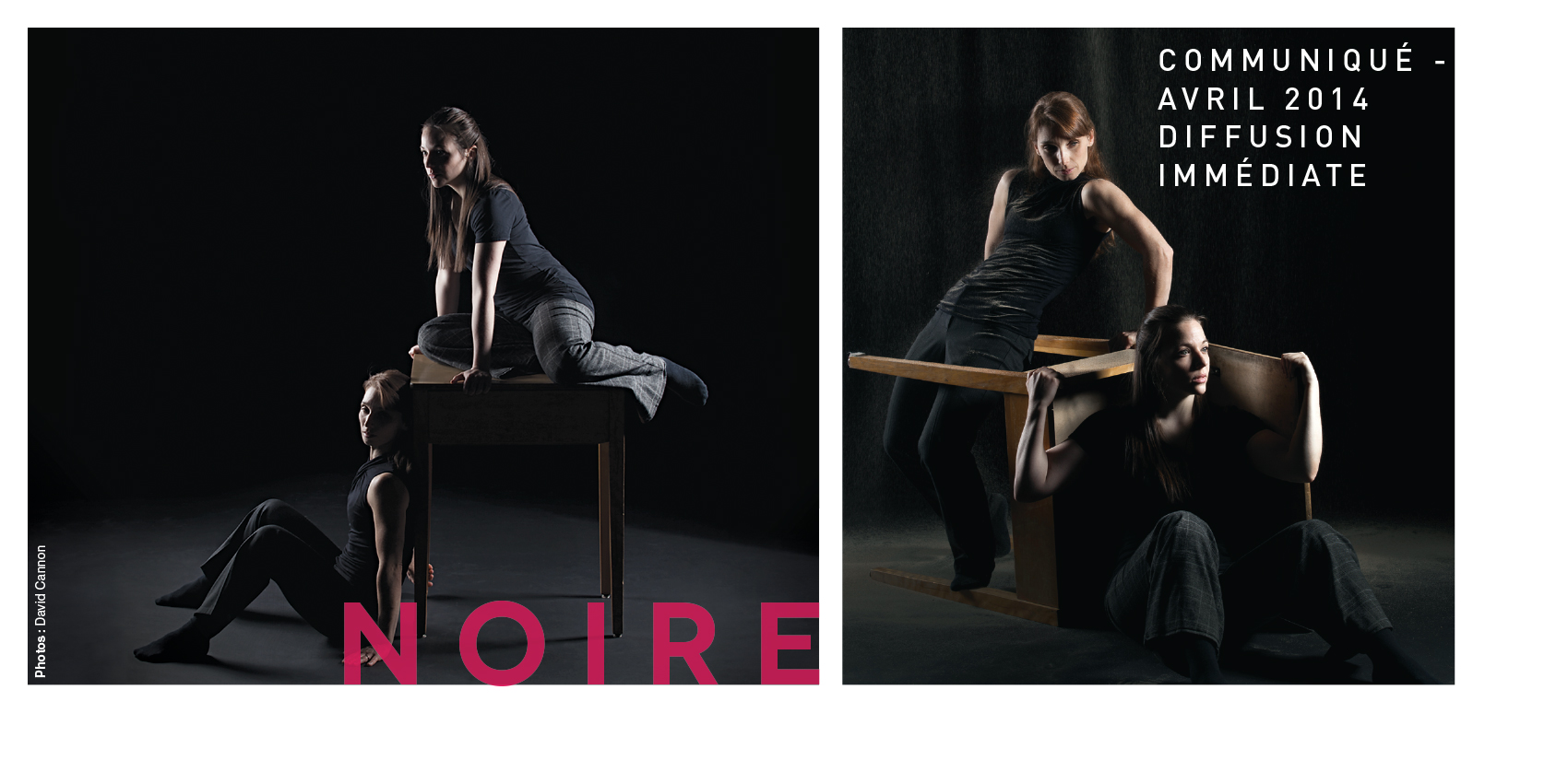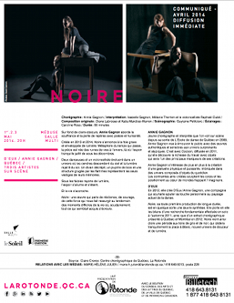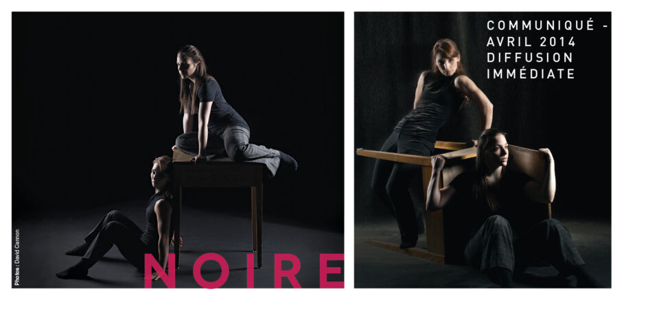 Noire, sa toute première production de longue durée, est en quelque sorte une œuvre synthèse. Elle porte en elle les bilans d’une recherche fondamentale effectuée en solo à l’automne 2011, ainsi que d’un extrait chorégraphique présenté à Québec et Montréal en 2012. Noire vient ainsi clore une période aux tons de gris et de noir, qui cèdera tranquillement la place à Blanc, nouvel univers de douceur et de lumière.