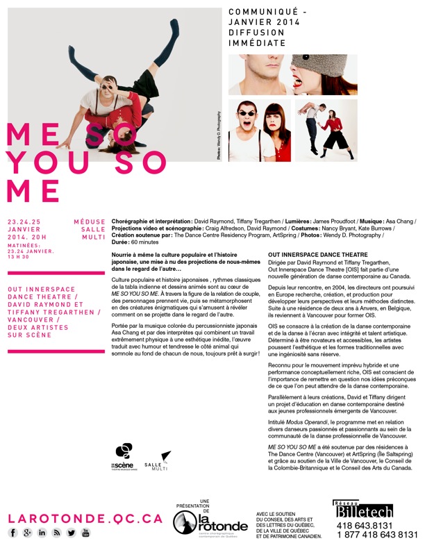 ME SO YOU SO ME a été soutenue par des résidences à The Dance Centre (Vancouver) et ArtSpring (Île Saltspring) et grâce au soutien de la Ville de Vancouver, le Conseil de la Colombie-Britannique et le Conseil des Arts du Canada.