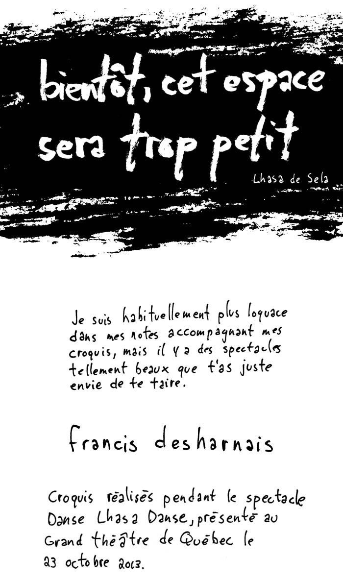 Curieux du résultat d’un brillant mariage entre danse et BD? Francis Desharnais vous propose son coup de crayon inspiré par le merveilleux spectacle Danse Lhasa Danse qu’il a croqué en direct. Laissez-vous emporter par ce délice visuel!
