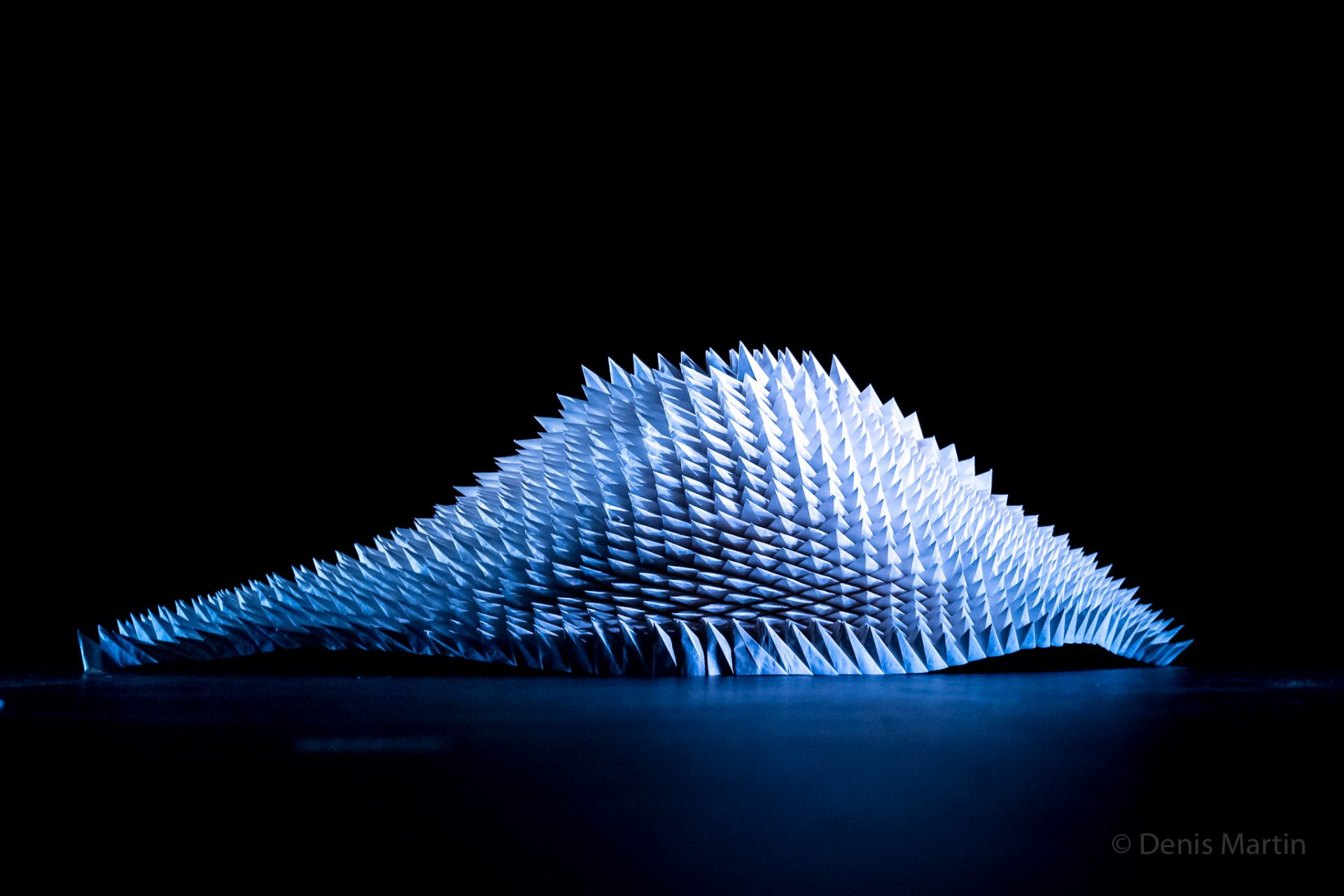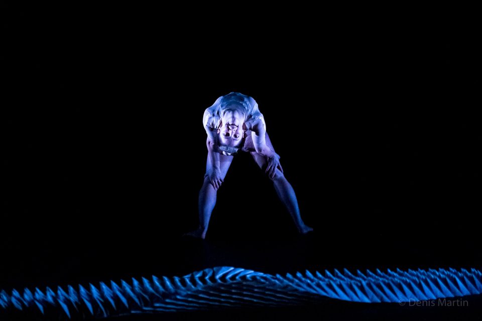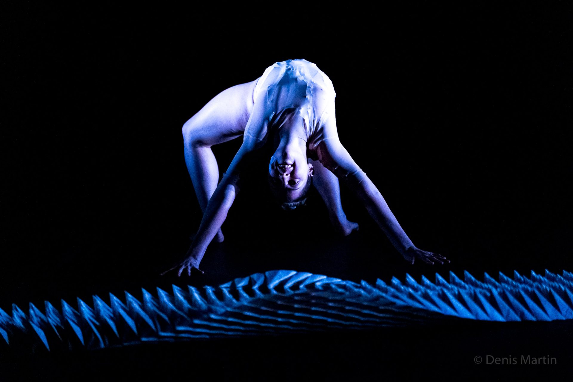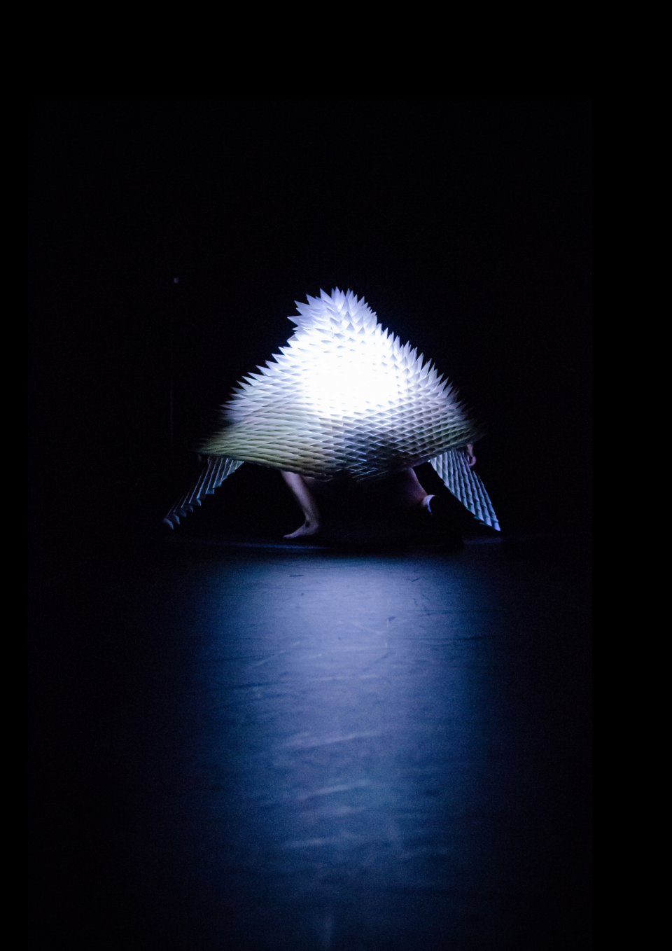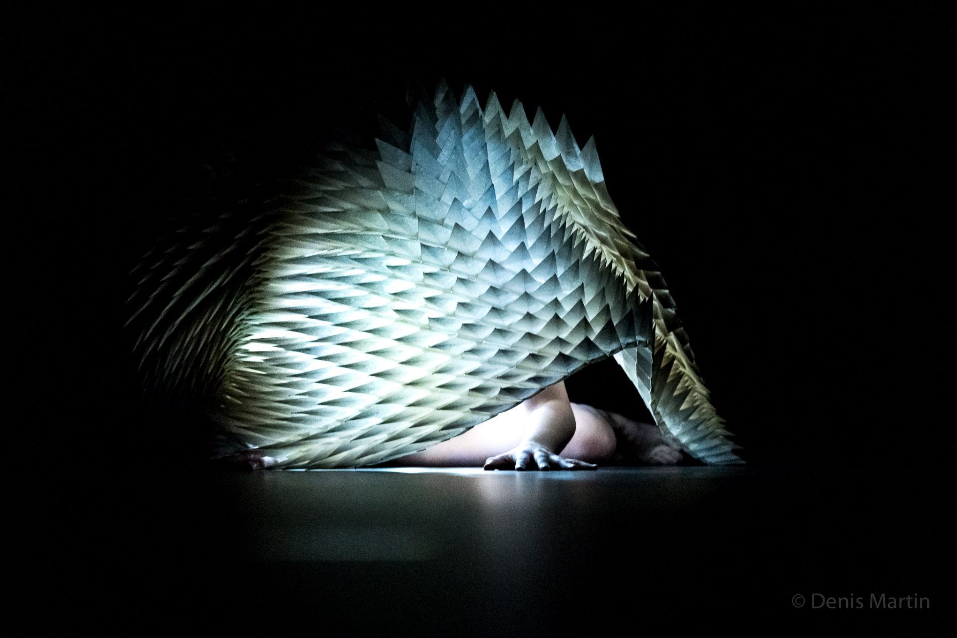 Habitat is a solo inspired by the life cycle of hermit crabs as a metaphor for the emigration process of dancer Bettina Szabo. Transdisciplinary, this work combines dance and voice with real-time controlled aspects, including digital lighting and a fascinating sculpture, Hermès, an assemblage of 800 articulated paper cones that add to the intriguing character of the dance itself.