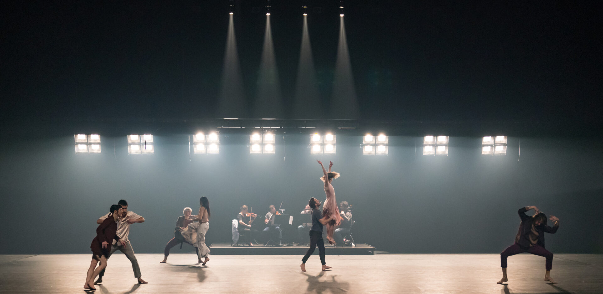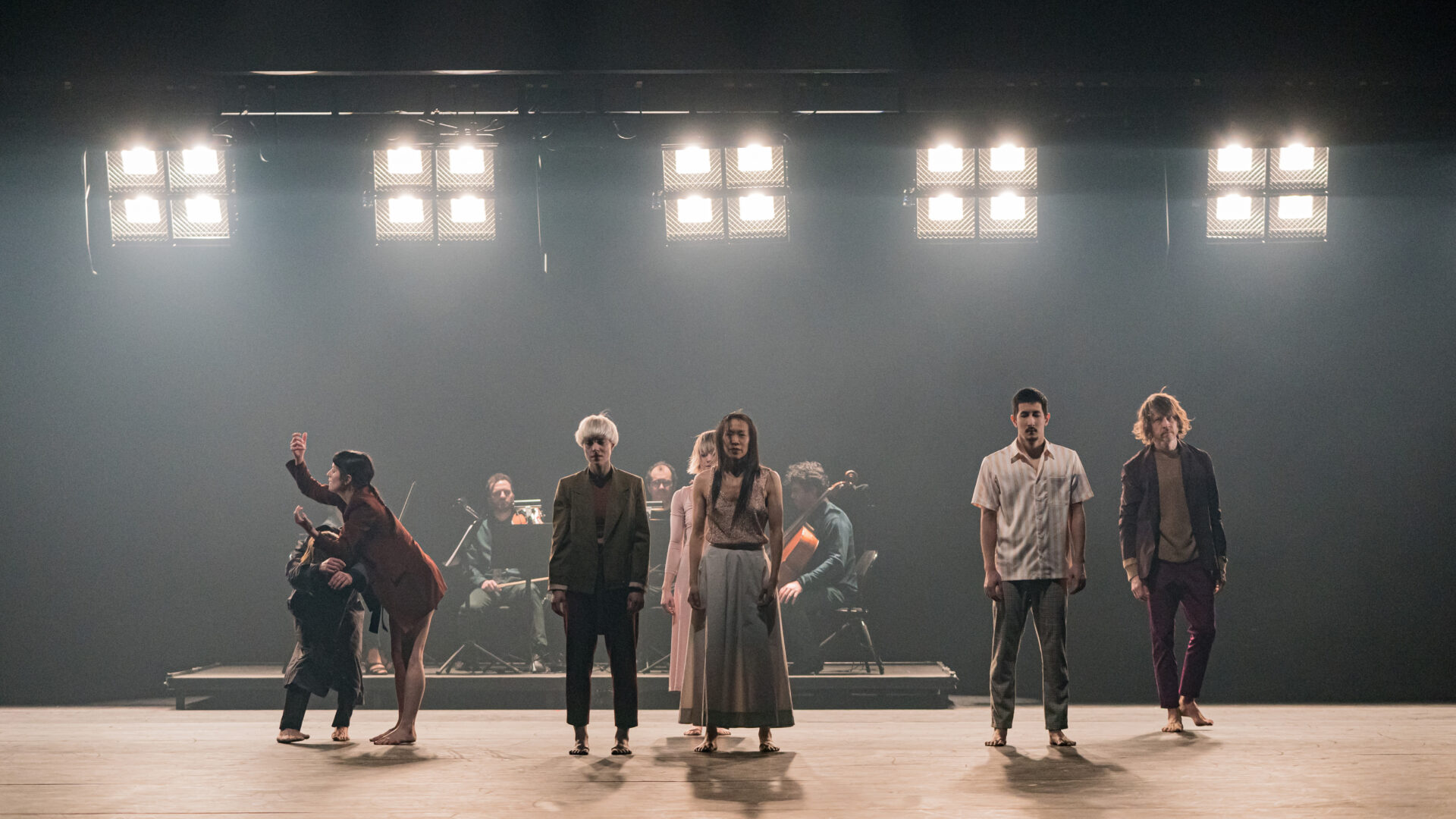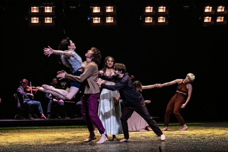 After the remarkable presentation of her first international production Beating, Virginie Brunelle brings us a daring creation and her most ambitious to date. Les corps avalés is a moving human odyssey where the choreographer’s sensitive intelligence leads the audience to a lighted introspection. A living fresco depicting present-day society, the work explores the coexistence of distress and hope, of brutishness and compassion. It questions the legacy and role of humans on Earth, in an uprising that gives hope for the creation of a collectivism that is directed at the other. Mastering a delicate balance between expressiveness and the vigorous physicality of gestural language, Brunelle invites the Quatuor Molinari on stage and directs eight dancers to depict a tired humanity in search of gentleness and solidarity. Elegant and intoxicating, the dance is also healing.