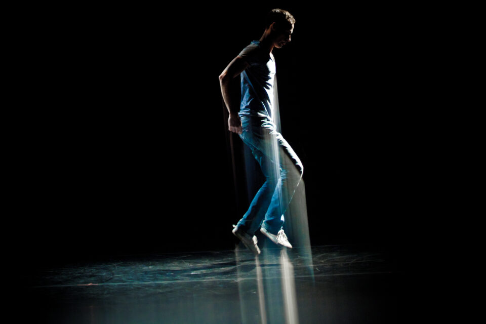 Fil conducteur propose une polyvalence et une gestuelle qui se nourrit de la résonance constante du corps. La résonance des mains qui frappent, la résonance des pieds qui giguent, la résonance fluide qui parcourt le corps. La résonance a toujours ici une force d’impact qui ponctue la performance et exacerbe l’instabilité constante du danseur. La recherche de l’équilibre sur un sol instable.