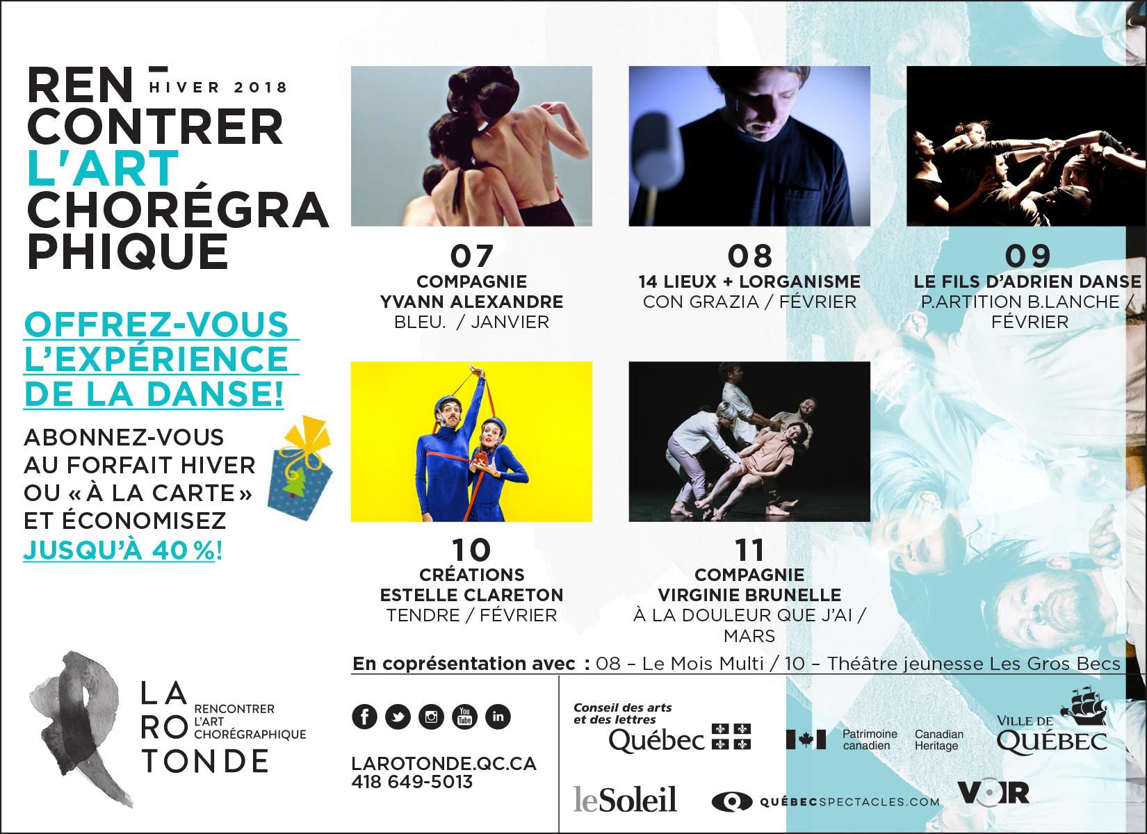 En février le projet interdisciplinaire dédié à l’agonie du monde matériel et mené par Martin Messier et Anne Thériault (14 lieux et Lorganisme) Con grazia, sera coprésenté dans le cadre du Mois Multi. La compagnie Le fils d’Adrien danse de l’attachant chorégraphe de Québec Harold Rhéaume célébrera la beauté et l’empathie avec sa toute nouvelle et attendue création P.artition B.lanche. Le mois se conclura avec Tendre, touchante et réjouissante pièce jeunesse d’Estelle Clareton en coprésentation avec le Théâtre jeunesse Les Gros Becs.