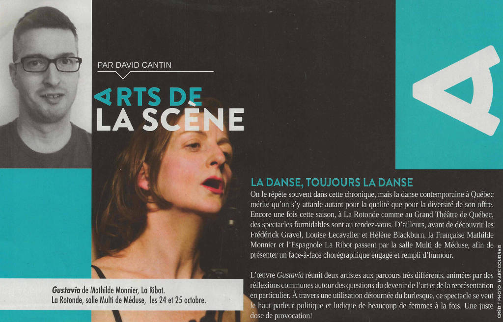 David Cantin, dans sa récente chronique sur les arts de la scène dans le Magazine Le Clap, s’enthousiasme à propos de quelques-uns des spectacles de danse à voir cette saison à La Rotonde et au Grand Théâtre, et s’arrête plus particulièrement à Gustavia, spectacle de Mathilde Monnier et de La Ribot, que La Rotonde recevra en octobre.