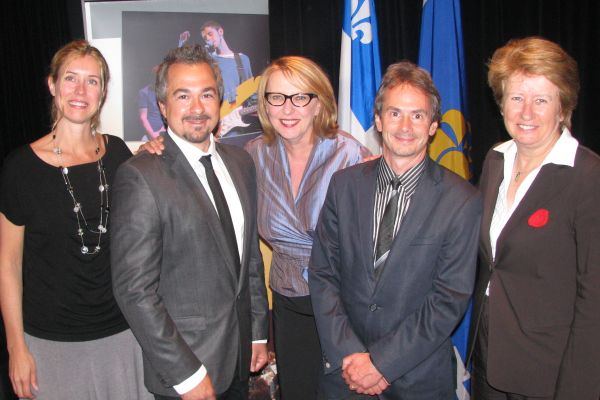 Cinq intervenants fort satisfaits de la tournure des événements; la responsable de la culture, du patrimoine et des communications à la Ville de Québec, Julie Lemieux, le directeur général et artistique de La Rotonde, Steve Huot, la ministre de la Culture, des Communications et de la Condition féminine, Christine St-Pierre, le président du conseil d’administration du Groupe Danse Partout, Daniel Cooper et la députée provinciale de Taschereau, Agnès Maltais. (Photo Denis Fortin)