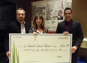 En effet, grâce à une participation de 5000$ de Telus, le concours sera lancé à l’échelle régionale au printemps 2012. Le 8 mars dernier, Monsieur François Houde, directeur de comptes chez Telus, est venu remettre officiellement le montant de la participation de Telus Québec à Steve Huot, directeur général et artistique de La Rotonde et Valérie Lacasse, coordonatrice du projet, Caroline Paré, initiatrice de Marquer la danse ne pouvant pas être des nôtres.
