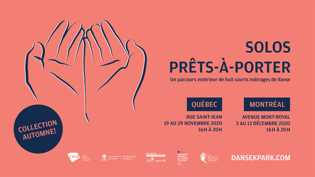 C’est avec joie que nous nous associons à Danse K par K pour la seconde phase du projet Osez! en solo : les Solos prêts-à-porter, collection automne. Du 19 au 29 novembre 2020, un parcours de huit courts métrages de danse sera accessible gratuitement sur la rue Saint-Jean. Et pour l’occasion, notre équipe a produit un balado!