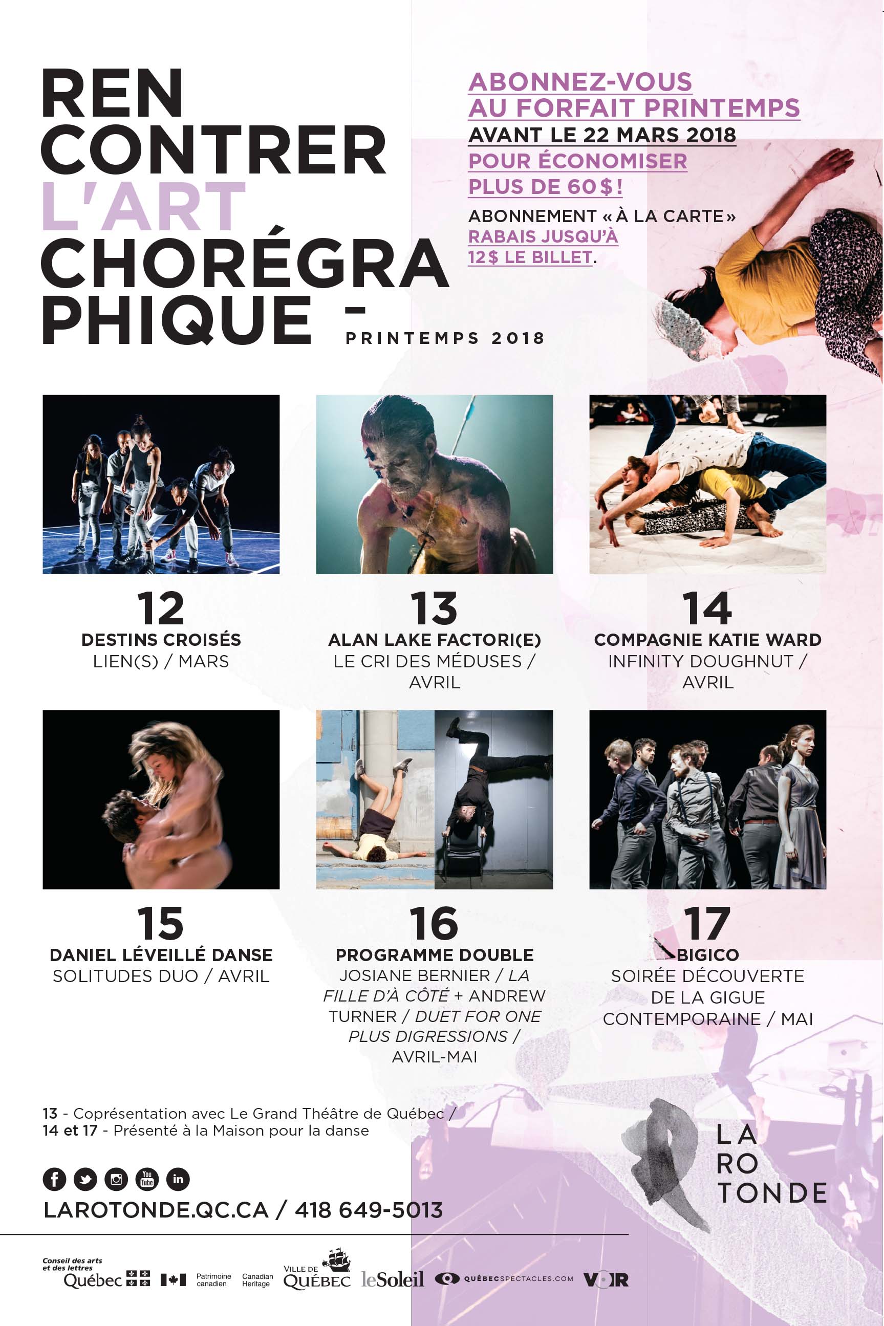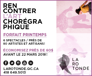 Il se poursuivra en avril avec pour la toute première fois en coprésentation au Grand Théâtre de Québec, Alan Lake, percutant chorégraphe de Québec et sa dernière création, Le cri des méduses, inspirée d’une forme d’état d’urgence. La saison serait incomplète sans la création incomparable de la Compagnie Katie Ward et sa performance immersive Infinity Doughnut. De retour cette saison, Daniel Léveillé offrira Solitudes duo, œuvre dans le sillage de Solitudes solo qui avait été présentée à La Rotonde en 2016. Le mois d’avril sera complété avec Andrew Turner et son oeuvre Duet for One Plus Digressions, qui sollicitera la capacité de visualisation du spectateur, en programme double suivi de la dernière création de l’artiste émergente de Québec Josiane Bernier, La fille d’à côté.