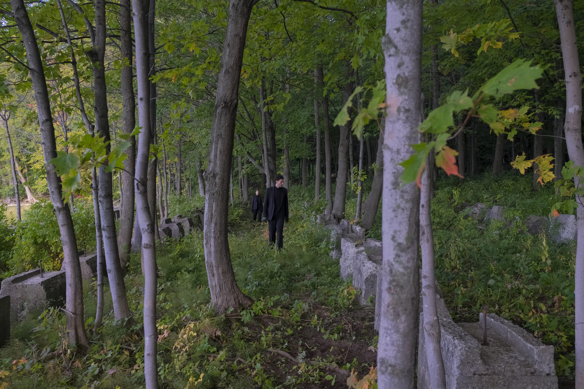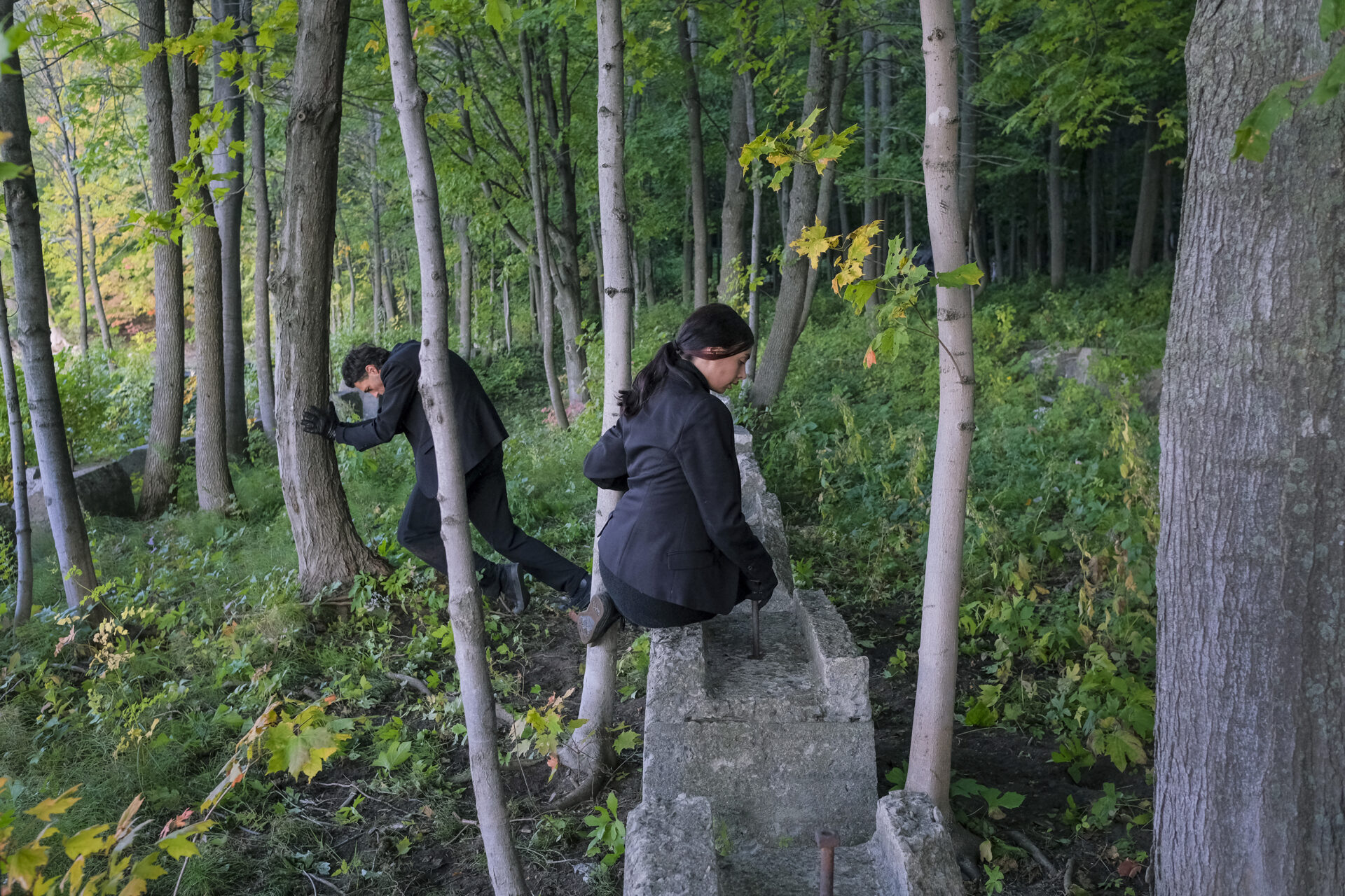 Dans La Forêt Mixte, la chorégraphe Danièle Desnoyers, figure emblématique de la danse au Québec, crée une gestuelle énergique modelée par le relief de la scénographie-paysage. Les vestiges du chantier maritime parsèment l’espace de lignes précises, balisant la danse. Jouant avec les perspectives, variant les rythmes, la présence des sept interprètes fait vivre une expérience singulière à chacune des personnes qui pénètre la forêt. Ensemble, public et artistes partagent ce dôme naturel rassurant où la cime des arbres définit les limites d’une performance envoûtante.