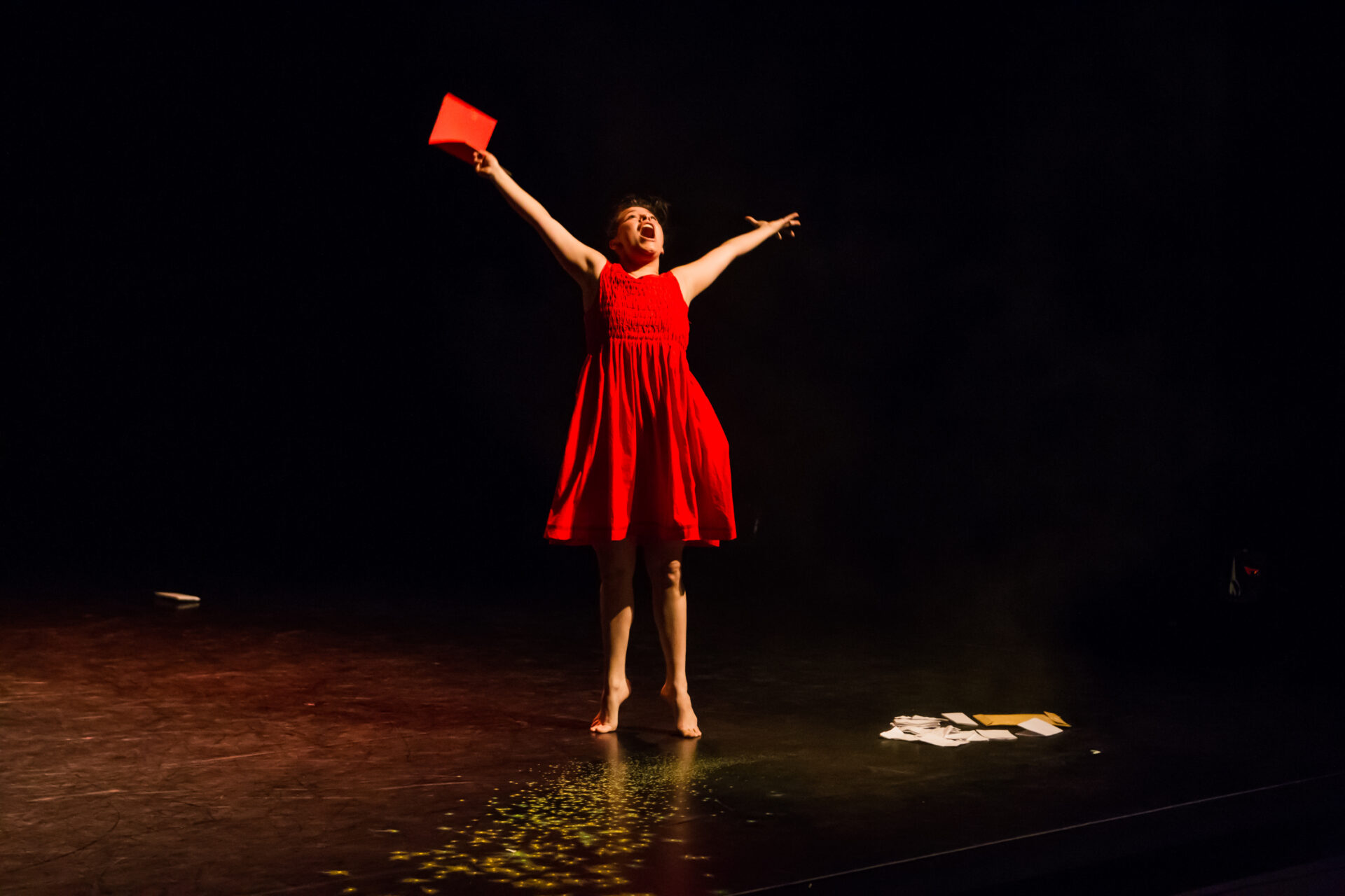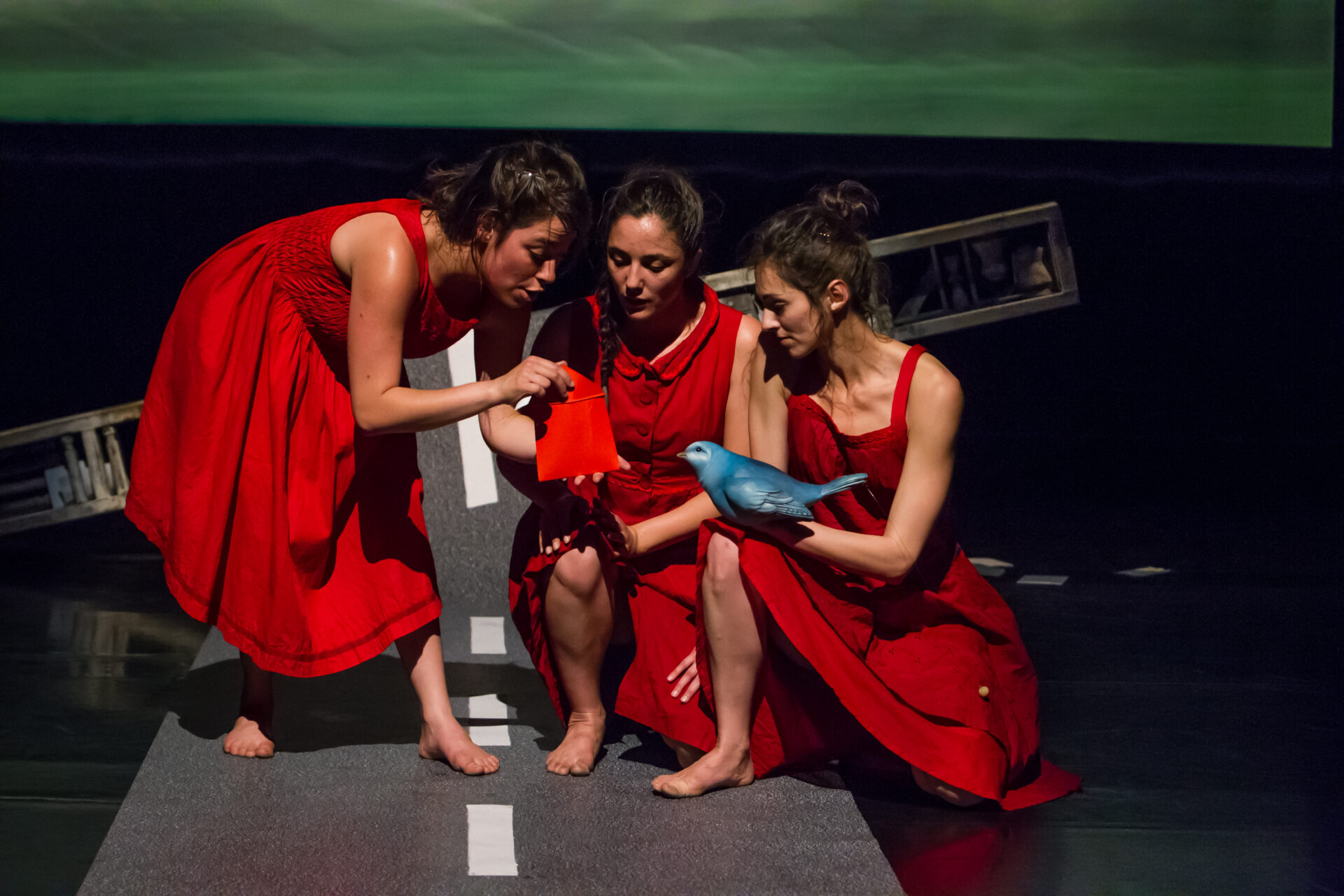 Un matin d’été, trois filles découvrent une montagne d’objets et de lettres déposés là, pour elles, au bord d’une route de campagne. Elles fouillent. Il y a des messages de tout le monde, sauf de leur meilleure amie Éléna qui reste muette pour une raison qu’elles ne s’expliquent pas. Il y a forcément une lettre d’elle! Au fil de leurs recherches, elles livrent les mots de tout un village qui, à petits pas, nous révèlent une vérité étonnante. Dans une mise en scène inventive et à travers les thèmes du deuil et de l’attachement, cette touchante histoire nous guide avec délicatesse et sensibilité vers l’acceptation. Une fusion complète entre la danse et les mots opère pour nous faire vivre une amitié puissante et énergiquement mise en mouvement.