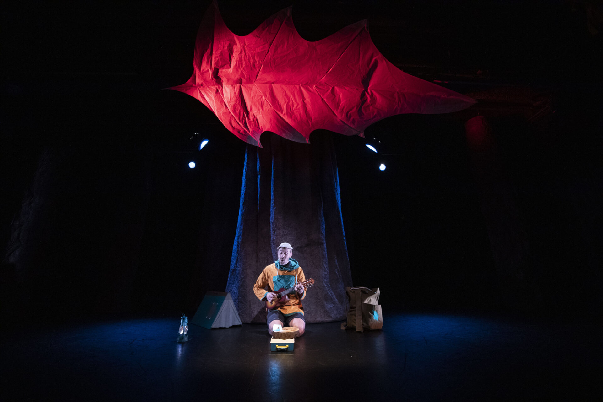 Sous une grande feuille qui change de couleur, près d’un tronc d’arbre magique où dansent les ombres, deux personnages jouent, campent, bougent, chantent et se transforment. Josué Beaucage et Ariane Voineau signent un premier spectacle pour bambins ingénieux, espiègle et rempli de moments doux.