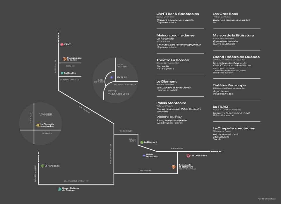 De St-Roch au Petit-Champlain, en passant par Montcalm, l’art théâtral, musical et chorégraphique seront à l’honneur. Sans franchir les murs, sans billets, les marcheurs découvriront ou revisiteront à leur rythme des lieux culturels rehaussés tantôt d’expositions multidisciplinaires, tantôt d’œuvres audios ou visuelles. Ponctué de 11 arrêts, ce parcours extérieur est une façon originale de faire rayonner autrement les arts vivants tout en favorisant son accessibilité. Sans murs ni billets vient bonifier l’offre culturelle estivale en plus de mettre en valeur la solidarité et la résilience des 16 organismes participants.