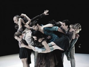 Cette danse symbolisait selon nous l’envol des humains, représenté entre autres par d’innombrables portés plus surprenants les uns que les autres. La force des porteurs et plus particulièrement celle du danseur Sylvain Lafortune, était tout aussi incroyable que les portés eux-mêmes. En amont du porté, il y avait cette peur de l’envol, de perdre pied, une hésitation qui apportait à la scène une vacillante valse de va et vient. Puis, le goût du risque prenant le dessus, les danseurs finissaient par courir vers un autre pour ensuite s’élever vers le ciel. L’autre partie que nous avons bien aimée était sans aucun doute celle avec les bottes de pluie, qui étant remplie d’eau, coulait sur le sol. Cette partie donnait naissance à des marches parfois déséquilibrées et d’autres fois très contrôlées qui apportaient à l’œuvre un autre aspect, plus humoristique, plus enjoué. Nous n’avons pu nous empêcher d’admirer l’habileté des danseurs qui ont su relever le défi d’exécuter gestes et déplacements sur ce plancher glissant. Les danseurs évoluaient sur scène telle une tribu, illustrant de façon poétique que le changement et les transformations surviennent d’abord d’un individu avant de se perpétuer sur les autres.