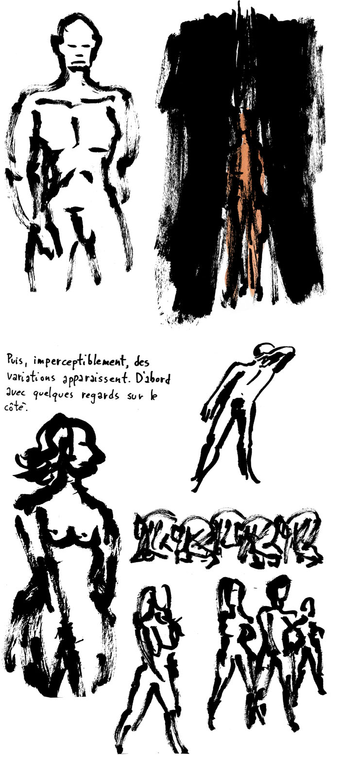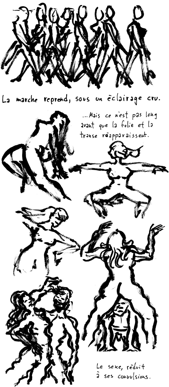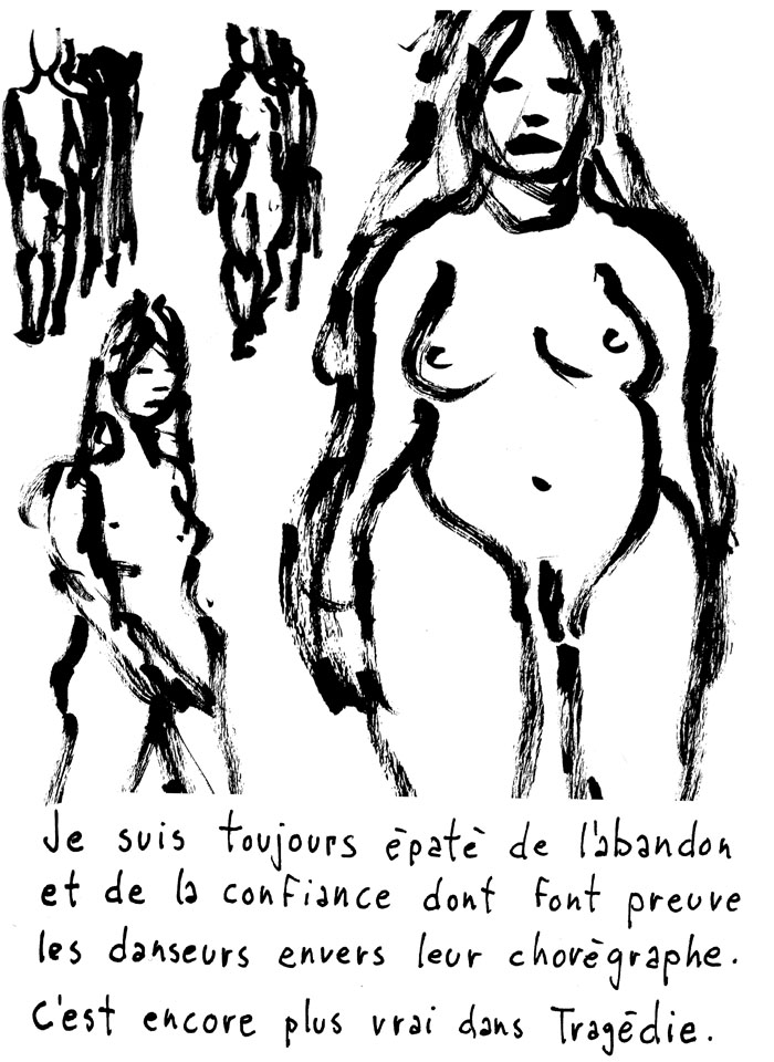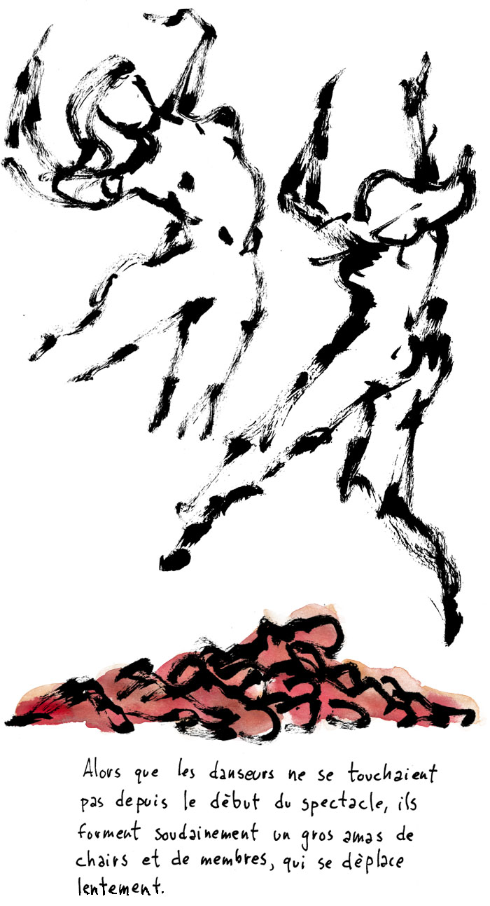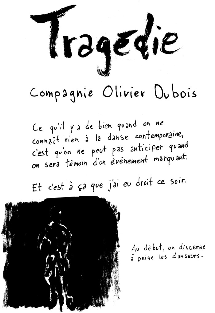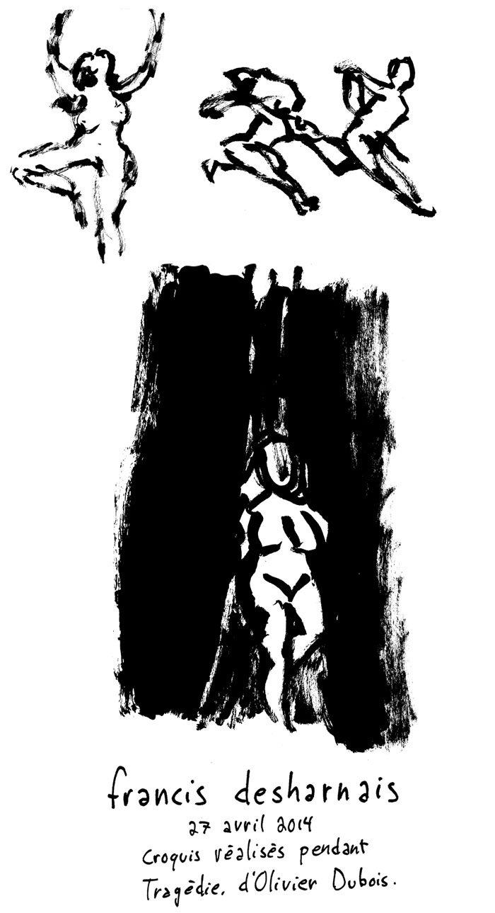Francis Desharnais a imprimé l’énergie sauvage de Tragédie dans ses croquis. Voici l’impact de cet excellent travail d’Olivier Dubois restitué en dessins punchés!