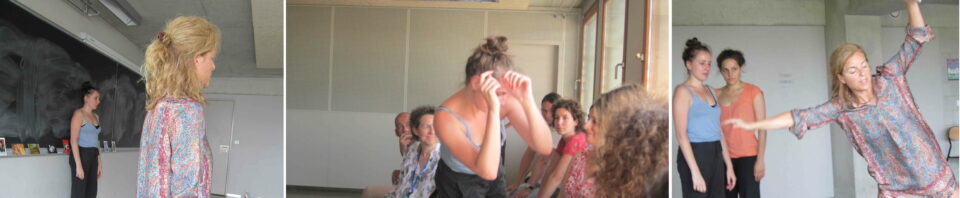 Caroline Paré, enseignante en danse au collège de Champigny; Léna Massiani et Mathilde Vrignaud, interprètes en danse à Paris. Atelier Marquer la danse – congrès IDEA – Paris.