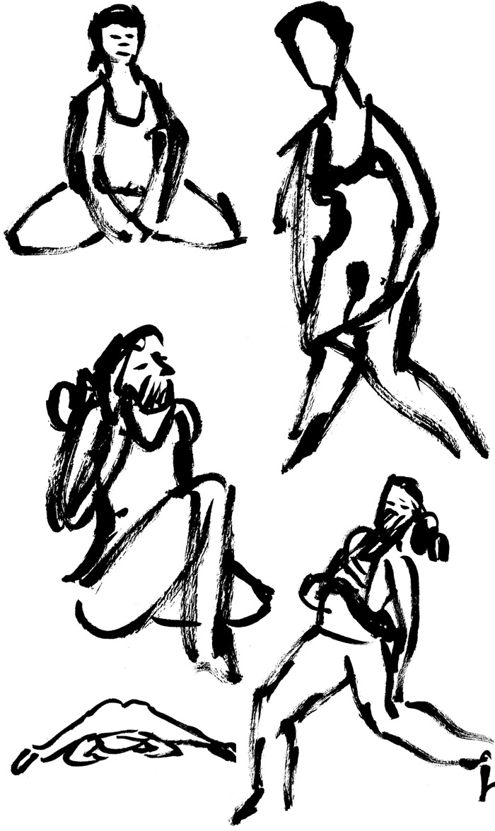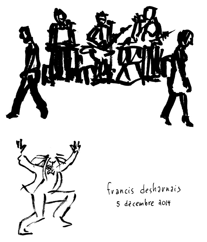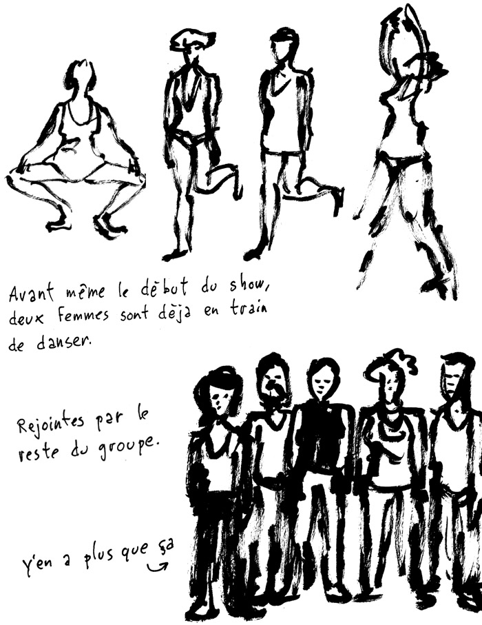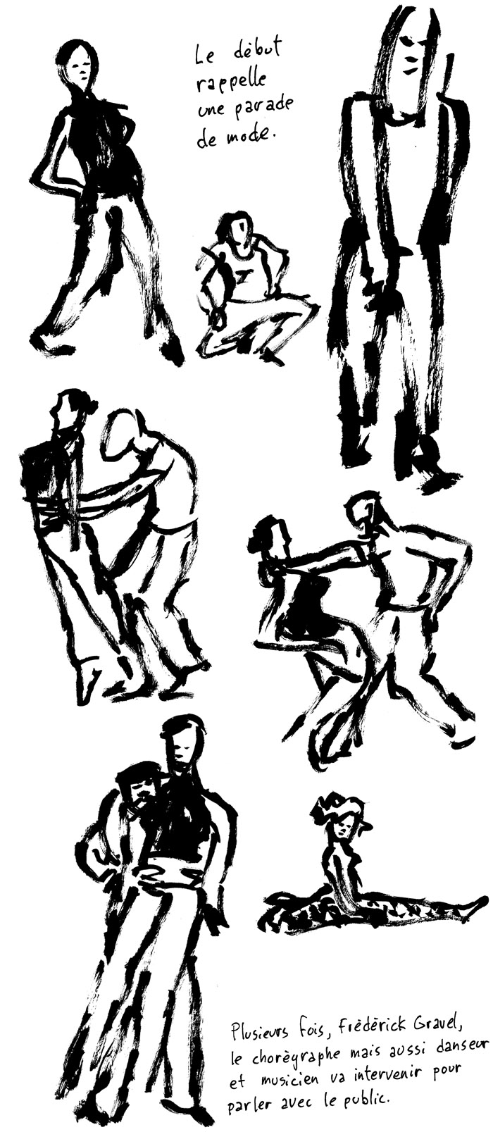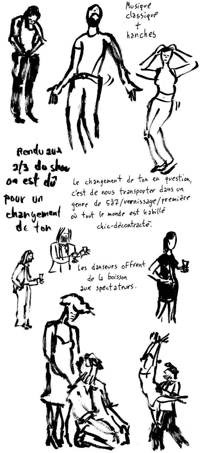 Habituellement, je fais mes croquis pendant le spectacle. Cela me permet de me laisser guider directement par le rythme, les mouvements, la musique, l’énergie. Par contre, ça n’est pas toujours possible et parfois je dois me contenter de regarder le spectacle à partir d’une captation vidéo, aussi bien dire par les yeux de quelqu’un d’autre.
